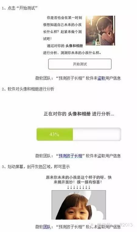 摘要:近日,有一款名为“测测你未来的小孩长相”的软件在微信上引起热门转发。继而又有消息称,使用这款软件会造成手机照片丢失。对此,微信团队进行了核实测试。测试结果显示,网友所反映的情况系谣言,该应用中产生的结果为随机图片,不存在盗取任何用户信息行为。